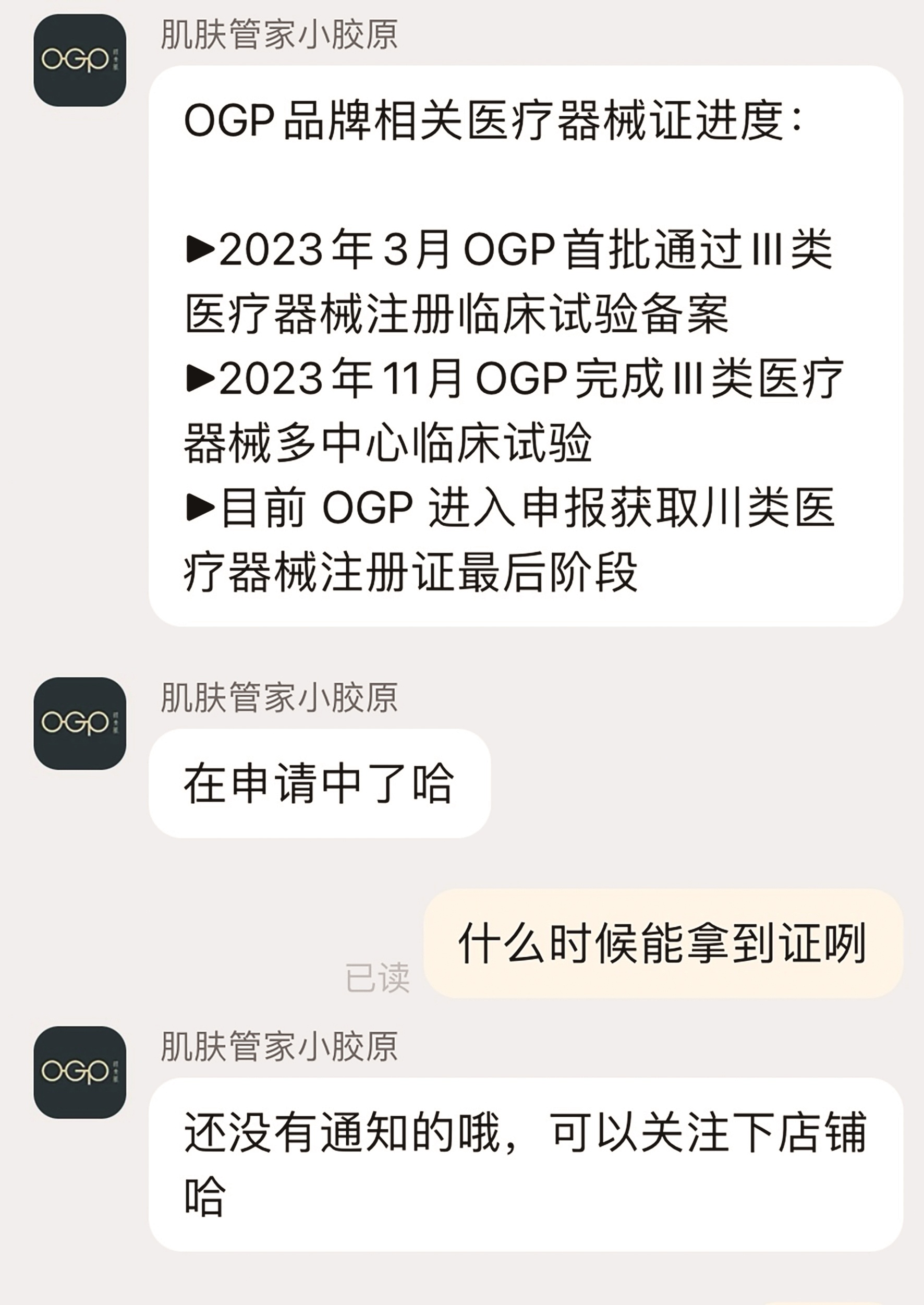 对于第三类医疗器械注册证的申请进度,美容仪品牌OGP表示,去年3月已首批通过国家三类医疗器械注册临床试验备案,去年11月完成国家三类医疗器械多中心临床试验,目前正进入申报三类医疗器械注册证的最后阶段。雅萌客服则表示,作为首批射频治疗仪三类医疗器械临床试验备案的品牌,目前还未取得医疗器械注册证,正在审批过程中。