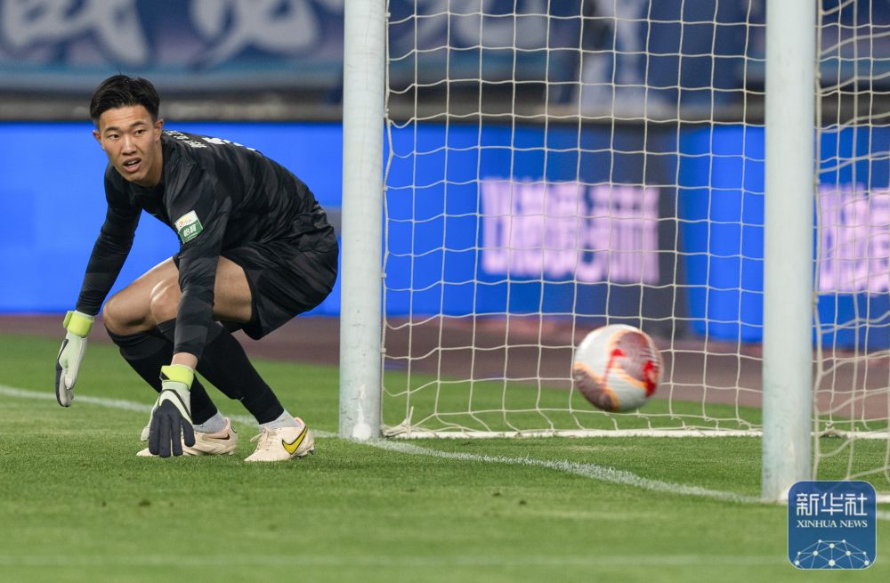 ↑武汉三镇队守门员魏黾哲在比赛中扑救失败。
