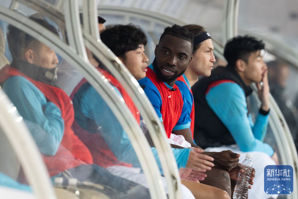 ↑沧州雄狮队球员奥斯卡(右三)在场边与队友交流。