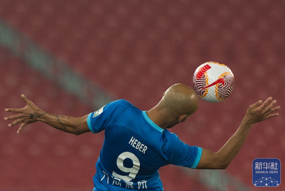 ↑沧州雄狮队球员埃韦尔在比赛中争顶。