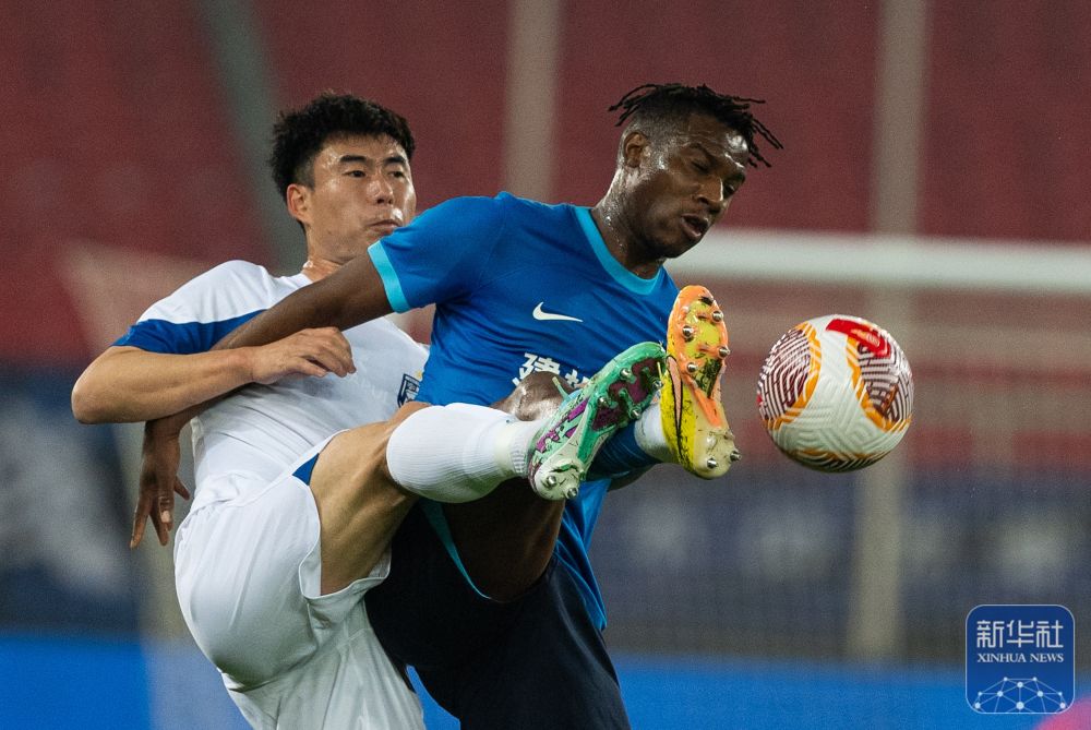 ↑武汉三镇队球员邓涵文(左)在比赛中与沧州雄狮队球员所罗门·奥塔博尔拼抢。