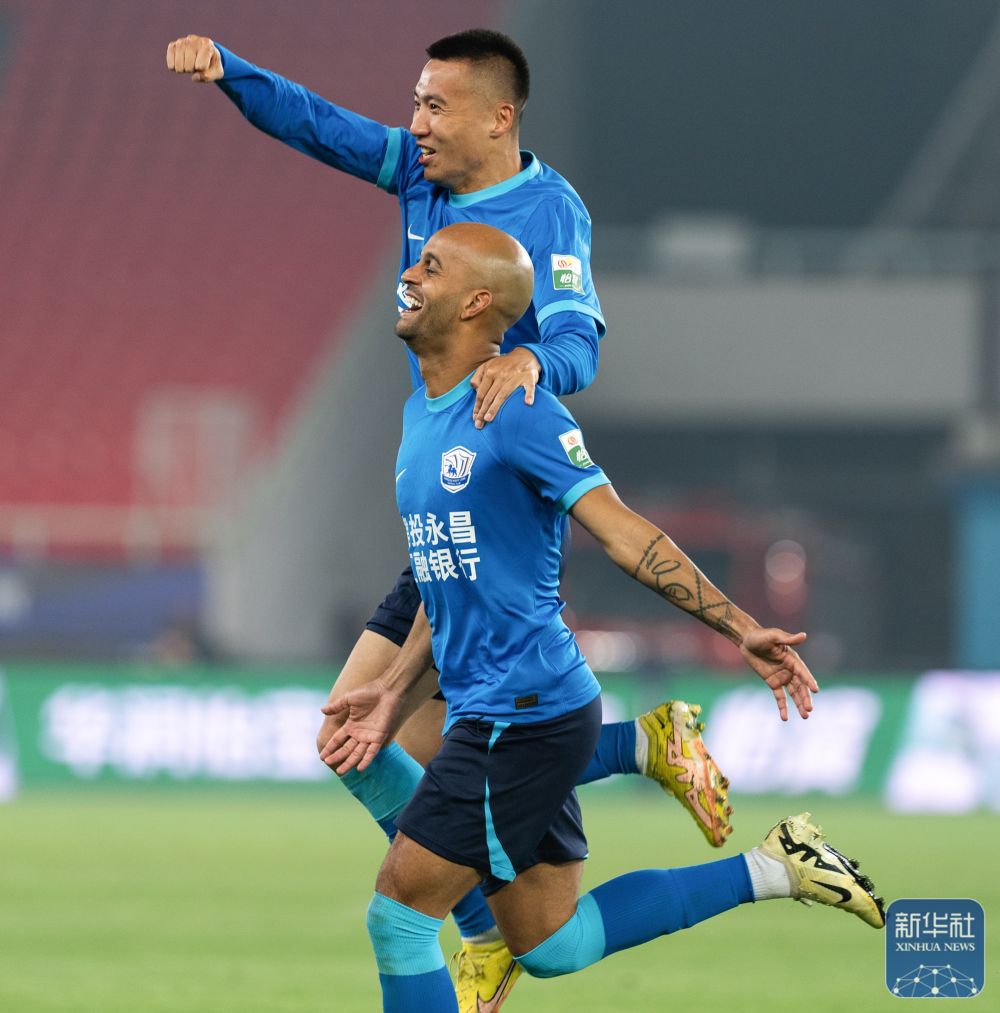 ↑沧州雄狮队球员埃韦尔(前)进球后与队友庆祝。