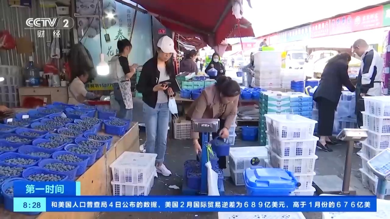 上午10时,在昆明的一家果品市场,蓝莓批发区生意火爆。大大小小不同品种的蓝莓,正在被打包、称重,发往零售市场。