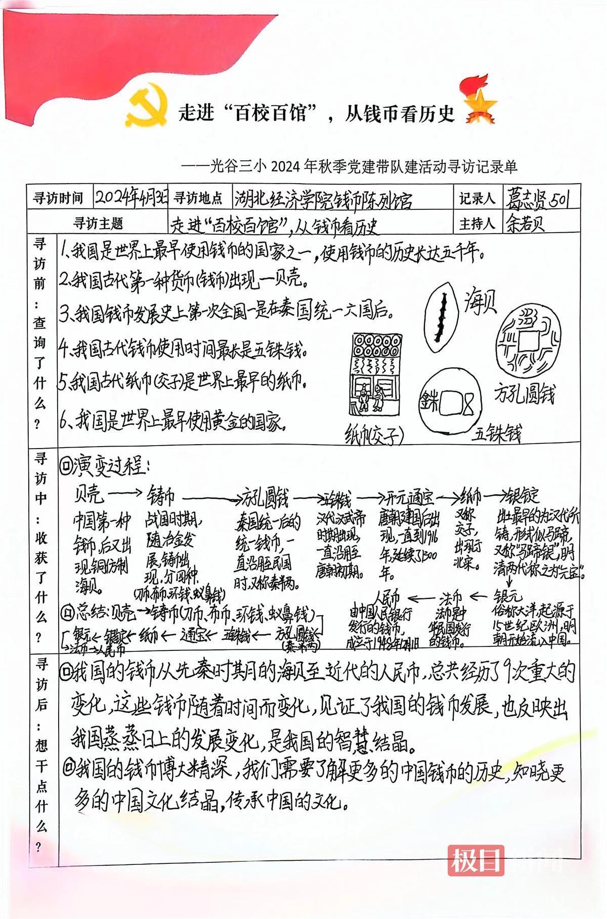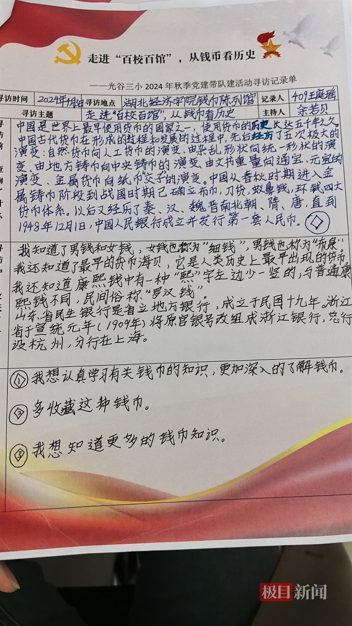 孩子们是揣着《走进“百校百馆”,从钱币看历史》的研学单来的。带队的光谷三小大队辅导员余若贝说:“我们提前几天在‘百校百馆’——湖北‘大思政课’实践教学平台预约了参观,这么好的教育资源,我们要充分利用好。我们有针对性地开发研学微课程,是希望孩子们能研有所思,学有所获。”