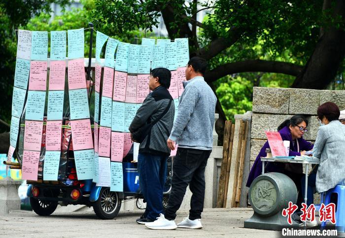 图为4月6日,福州于山传统相亲角,民众在相互交流子女情况。 中新网记者 张斌 摄