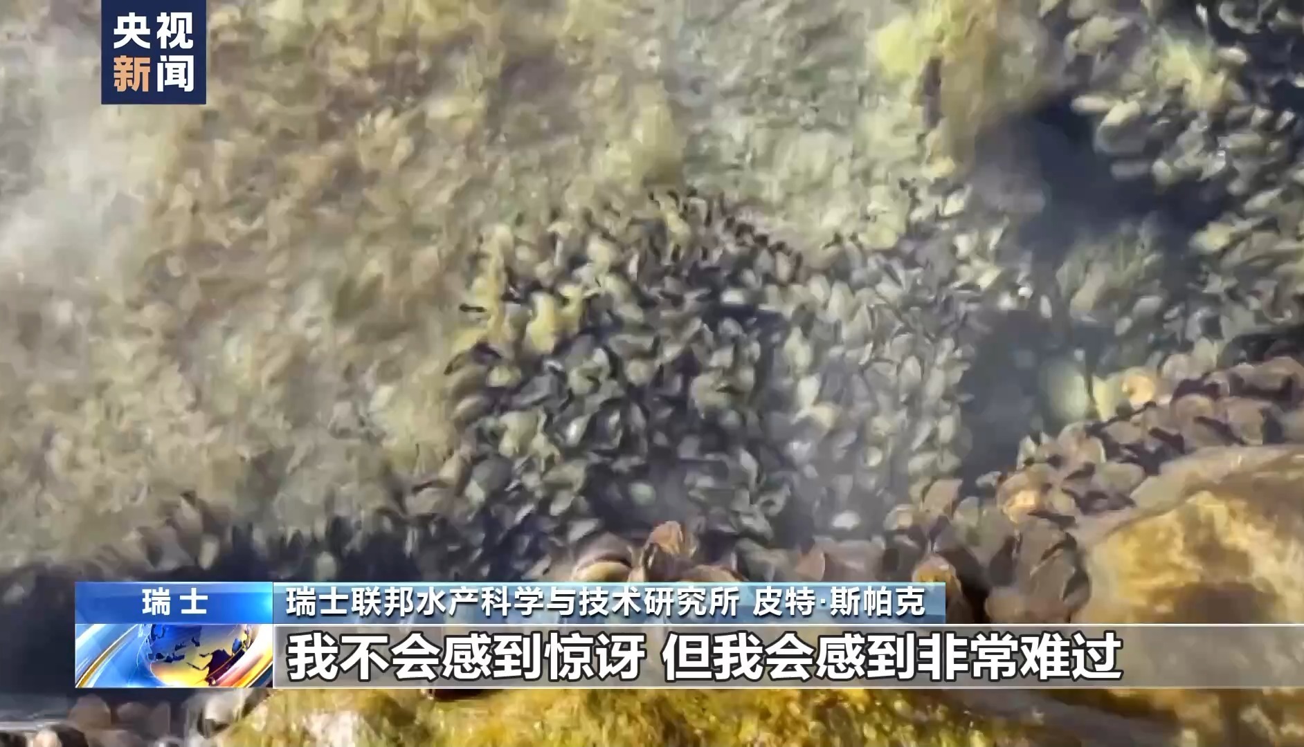 瑞士联邦水产科学与技术研究所 皮特·斯帕克:这是日内瓦湖,我们用一个视频系统下到湖中,这是四个地点。你可以看到这里的地面到处都是夸加贻贝,海量的夸加贻贝吃掉所有藻类,营养都不会进入食物链的后续环节,也不会供鱼类和人类使用。