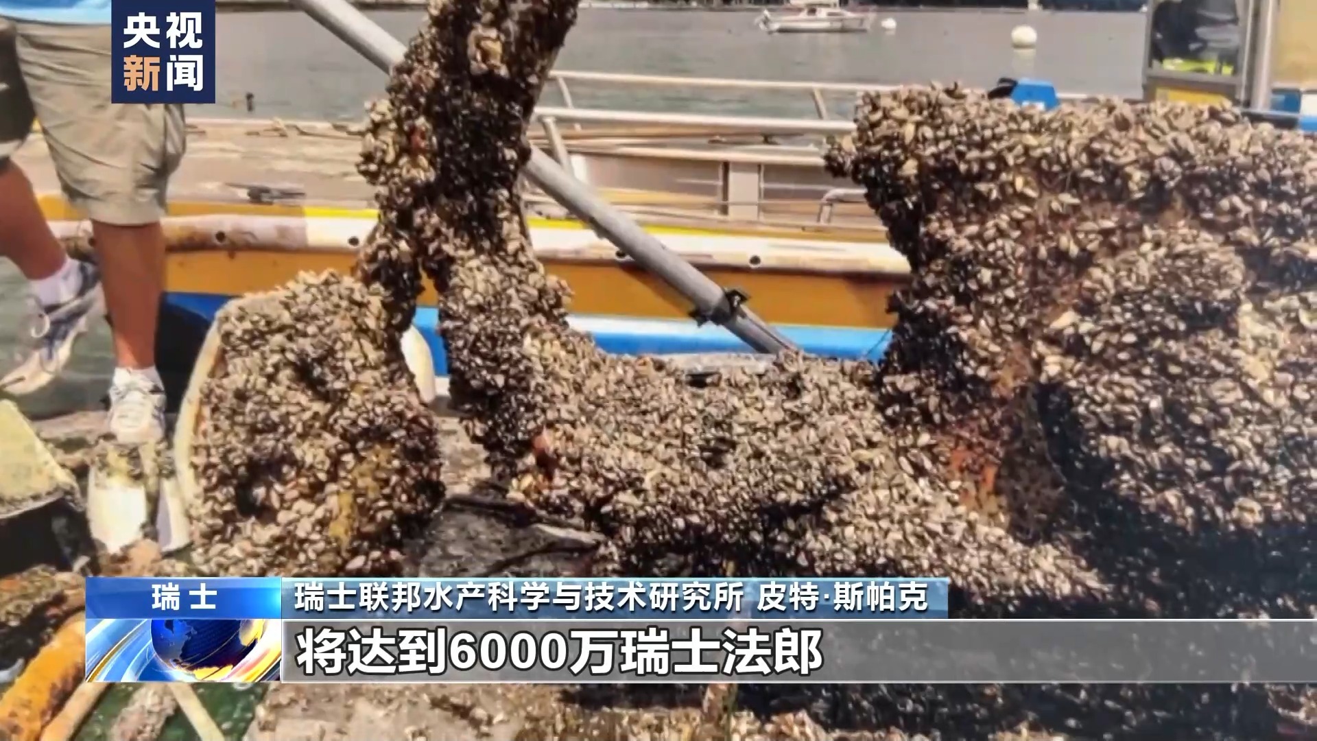 瑞士联邦水产科学与技术研究所 皮特·斯帕克:这些是来自洛桑联邦理工学院的水下管道,他们有一个冷却系统,用来冷却宿舍和教室,水源来自日内瓦湖,他们从60米深处抽取水。在以前,没有夸加贻贝时,这是安全的,因为夸加贻贝只在湖泊的上层,但现在他们在湖中的管道,基础设施上到处都是夸加贻贝。他们不知道这些生物来自哪里,估计修复这个问题的成本将达到6000万瑞士法郎。