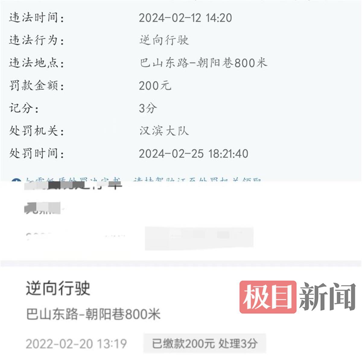 记者注意到,其他网友表示自己也遭遇了同样的处罚,认为这样的处罚让人无法接受。上述知情人士提供的另一张“违法处理”截图显示,2022年2月20日,其在巴山东路-朝阳巷800米处因“逆向行驶”被罚款200元、扣3分。