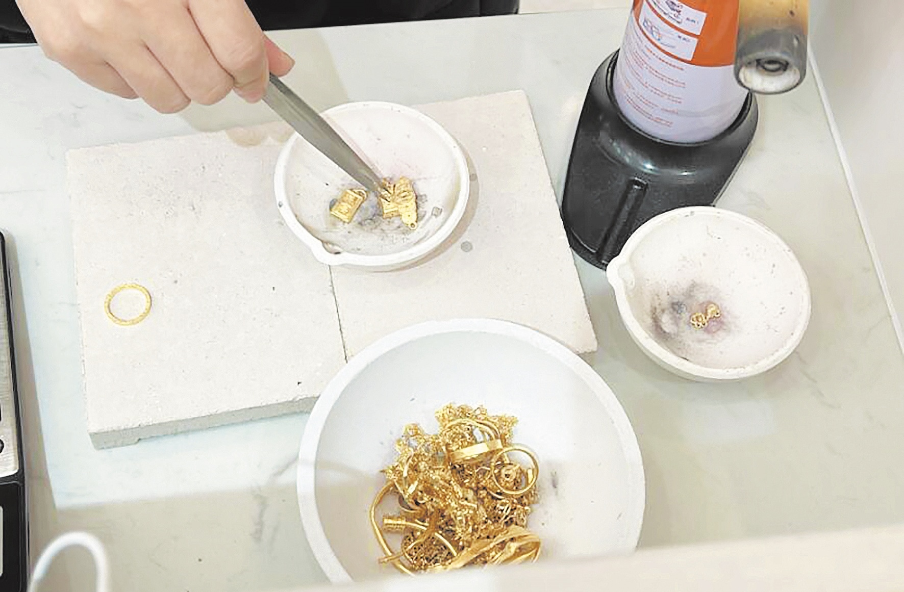 上述店员介绍,“打金”的过程并不复杂,顾客确定好克重和款式后,携带金条或旧首饰来到店内先测试纯度后进行称重,再经过熔金、锤打、锯切、焊接、抛光、印花等一系列步骤,一件新首饰就做好了。