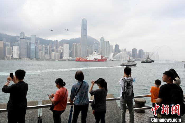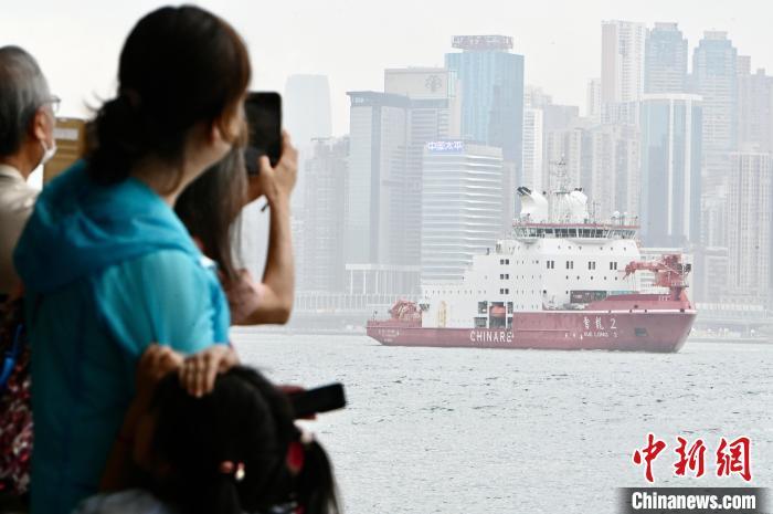 图为香港市民及游客观看极地科考破冰船“雪龙2”号在维港上航行。记者 李志华 摄