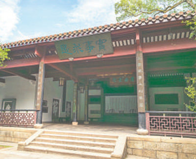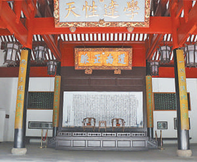 步入讲堂,正中摆放的两把古雅交椅,为纪念南宋理学大师朱熹和张栻而设,“朱张会讲”的盛景让人怀想。后方的木质屏风,刻有张栻撰写的《岳麓书院记》。