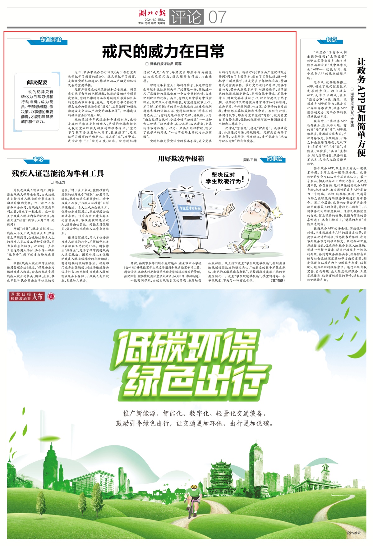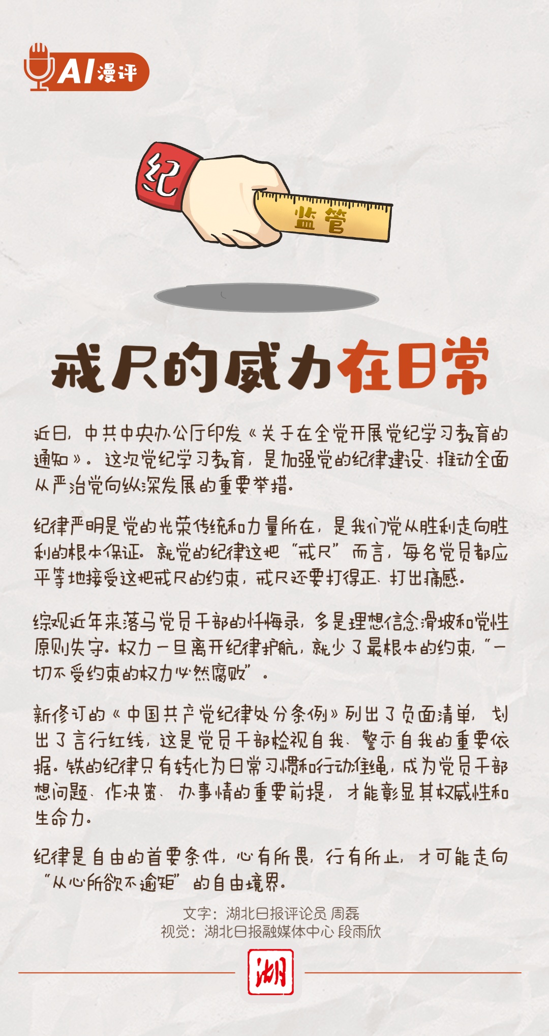 无论是战争年代还是和平建设时期,无论是战胜困难还是打败敌人,严明的纪律和规矩是我们党从胜利走向胜利的根本保证。“党纪学习教育要注重融入日常、抓在经常”,是党纪学习教育的明确要求。戒尺的“戒”,有警戒、戒除之意,“尺”就是尺度、标准。就党的纪律这把“戒尺”而言,每名党员都应平等地接受这把戒尺的约束,戒尺还要打得正、打出痛感。
