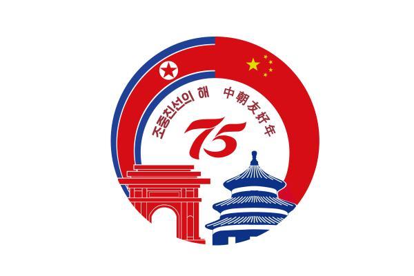 “中朝友好年”纪念标识整体为圆形。标识顶部圆环由中朝两国国旗组成,形成桥梁形状,象征中朝传统友好和民心相通。标识中部为红色“75”字样,使用中朝文标注“中朝友好年”,突出中朝建交75周年和友好年主题。标识底部由北京天坛祈年殿和平壤凯旋门艺术化图案组成,使用中朝两国标志性建筑突出特色。