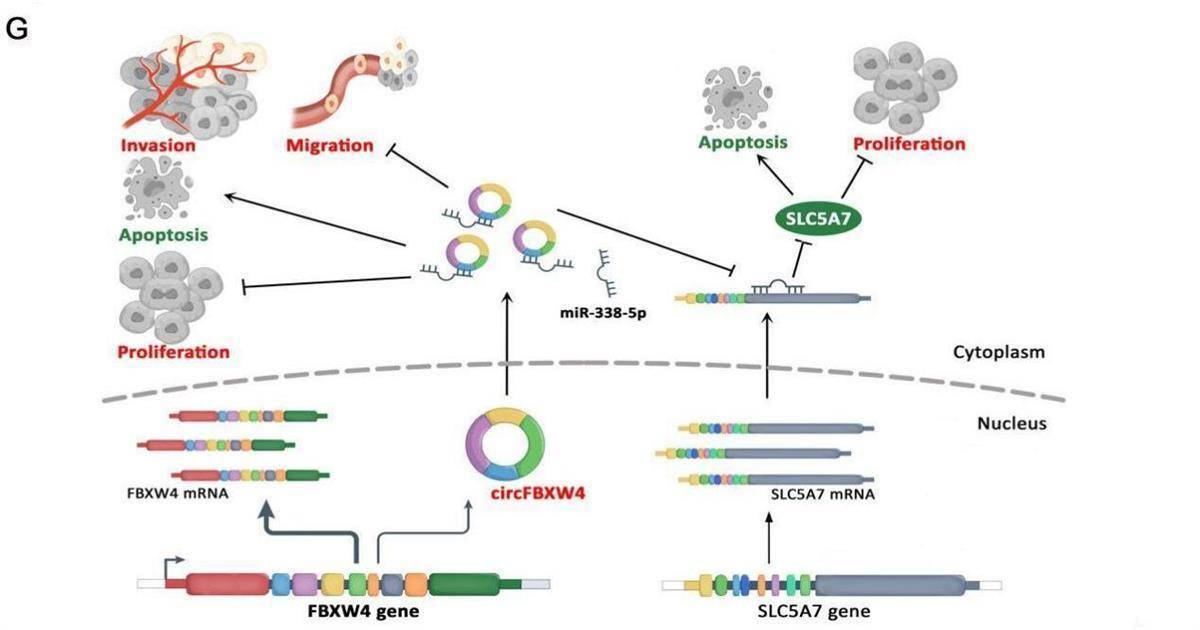 同时,本项研究在机制上阐明,circFBXW4作为miR-338-5p的海绵,通过与miR-338-5p的竞争性结合,解除miR-338-5p对SLC5A7表达的抑制作用,进而提高SLC5A7表达水平,最终抑制结直肠癌的进展。