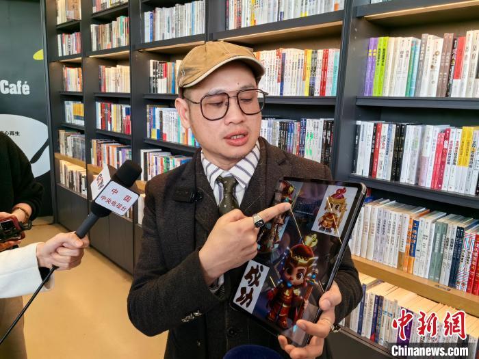 4月9日,在北京参加“纪念郑成功诞辰400周年暨两岸青年‘成功对话’读书沙龙活动”的台青薛颖穜向记者展示他设计的郑成功IP。中新社记者 刘玥晴 摄