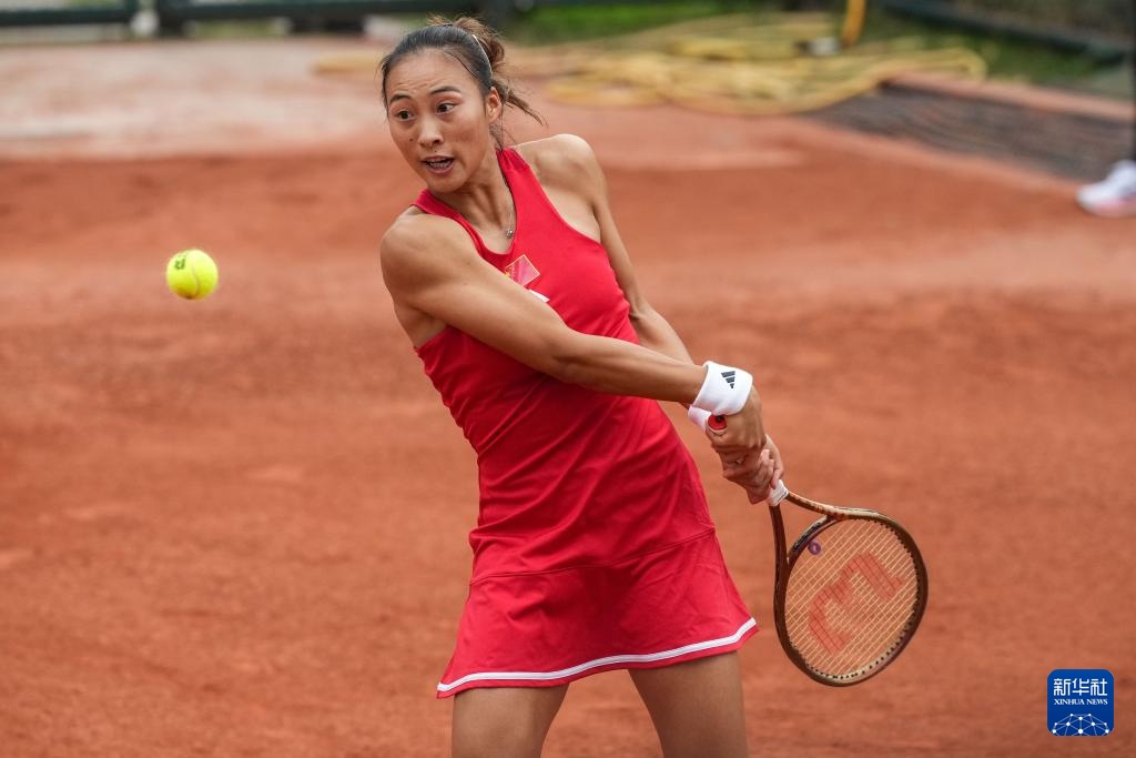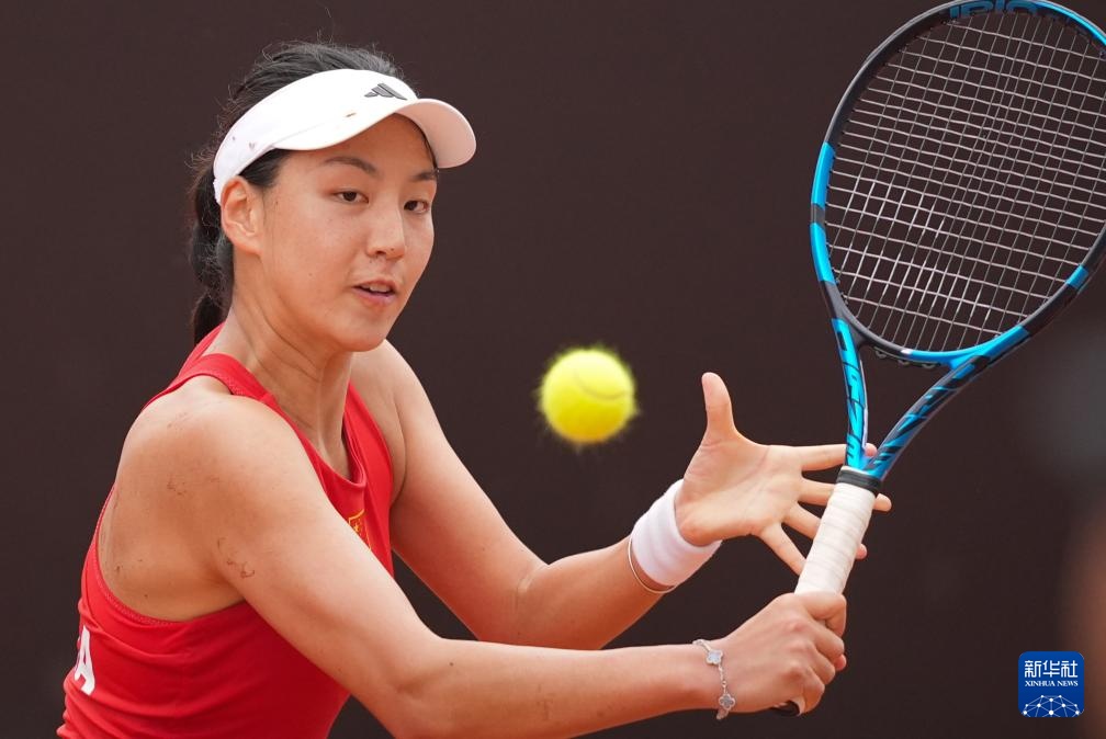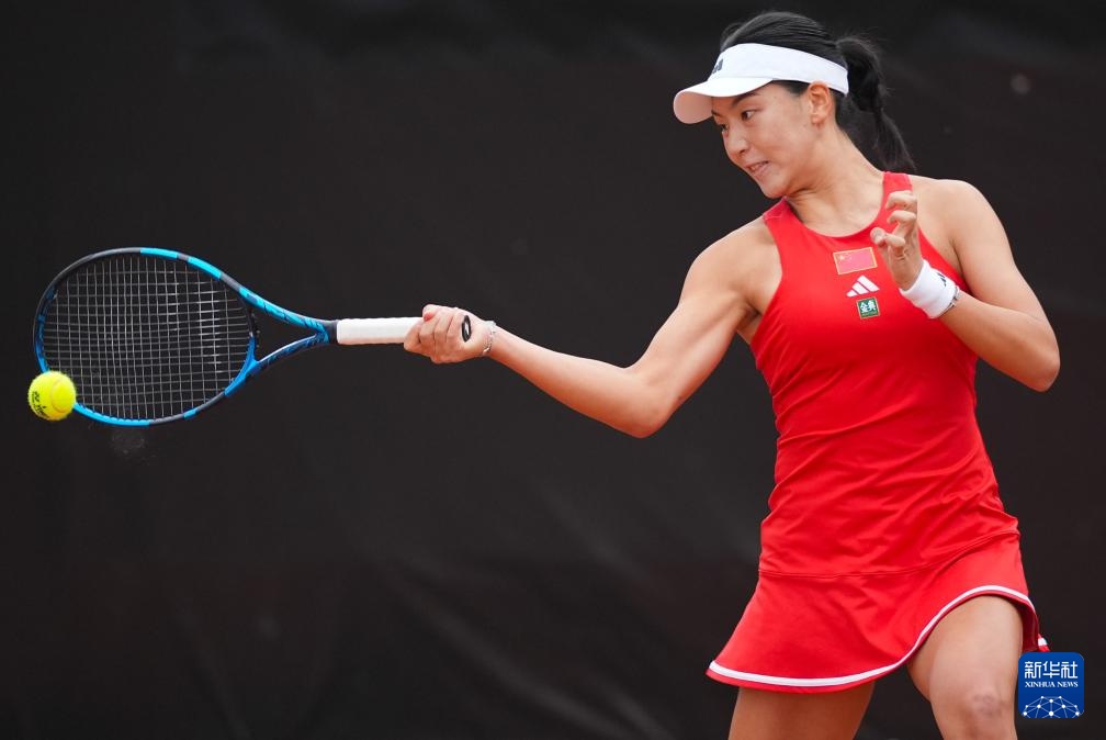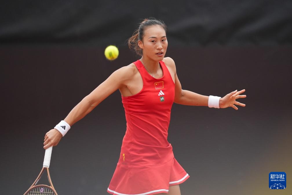 4月10日,中国队选手郑钦文在单打比赛中回球。她2比0战胜印度队选手安基塔·拉伊娜。新华社记者 陈思汗 摄