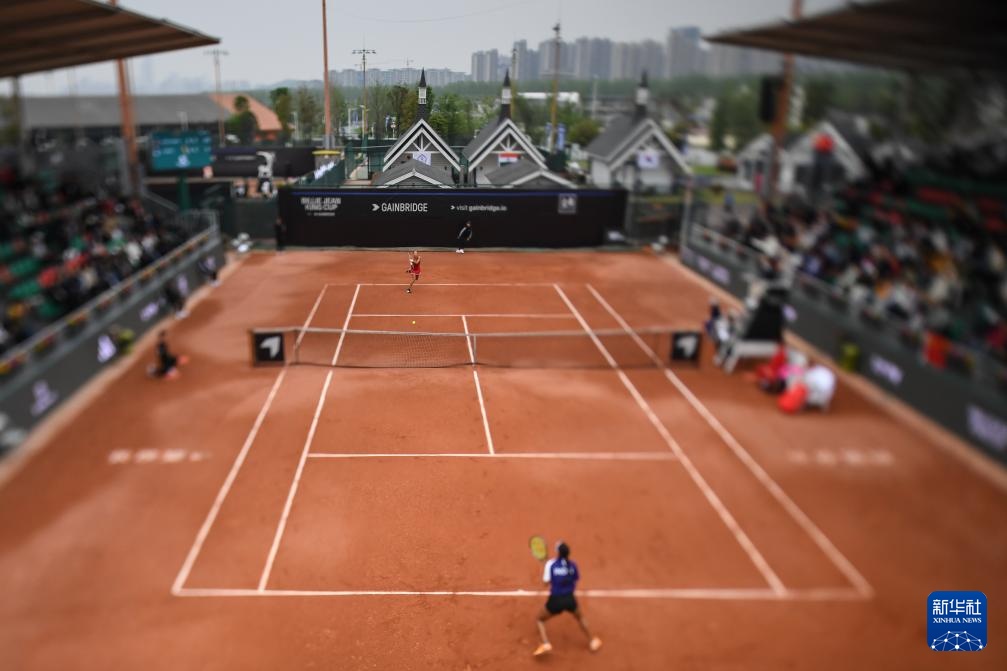 4月10日,中国队选手郑钦文(上)在单打比赛中回球。她2比0战胜印度队选手安基塔·拉伊娜(移轴镜头拍摄)。新华社记者 薛宇舸 摄