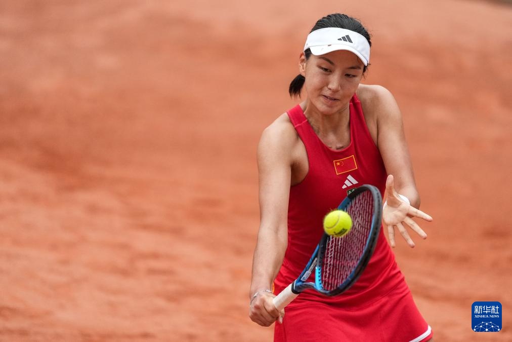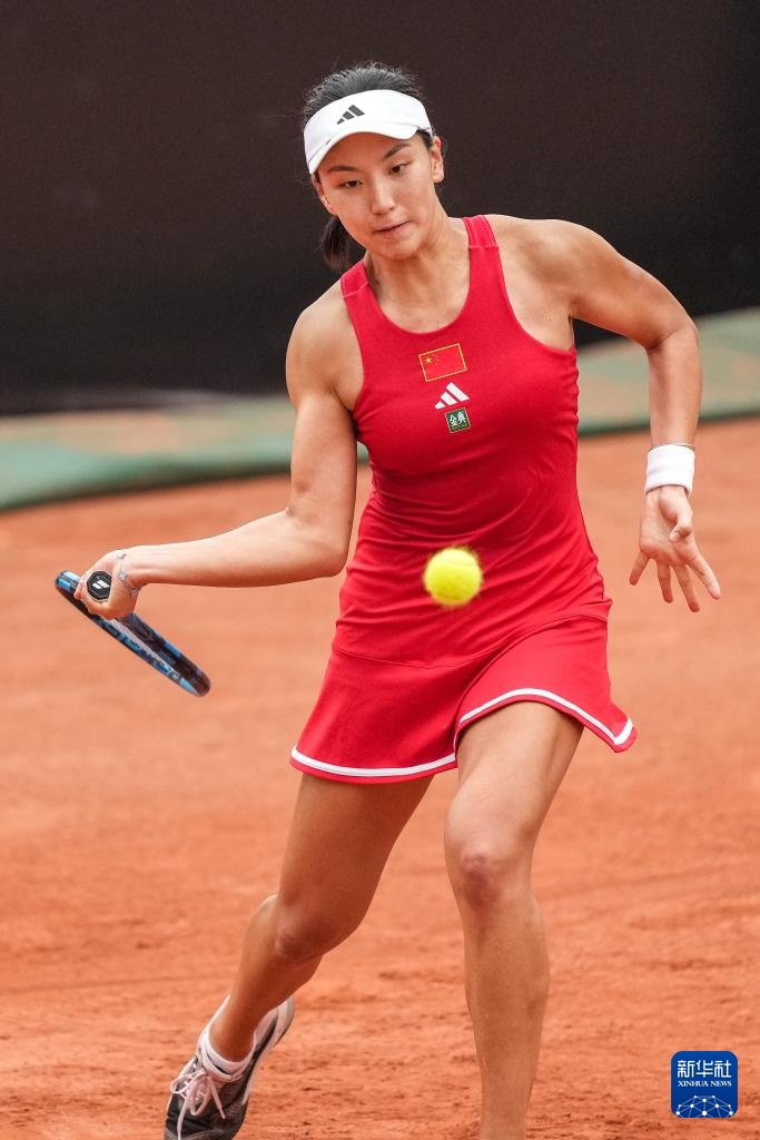 4月10日,中国队选手郑钦文在单打比赛中回球。她2比0战胜印度队选手安基塔·拉伊娜。新华社记者 薛宇舸 摄