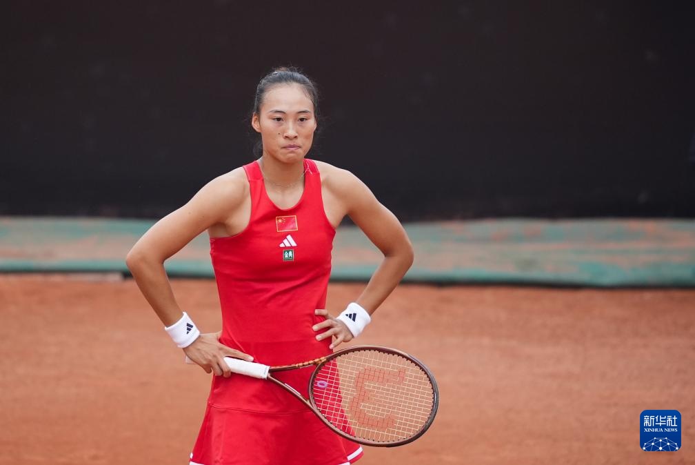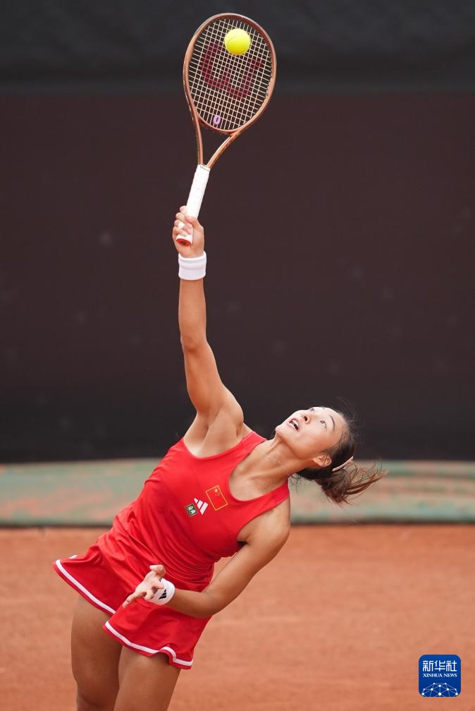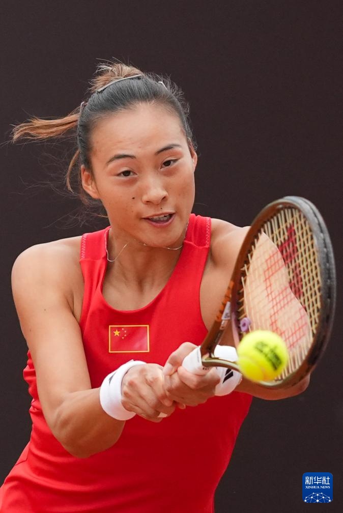 4月10日,中国队选手郑钦文在单打比赛中。她2比0战胜印度队选手安基塔·拉伊娜。新华社记者 薛宇舸 摄