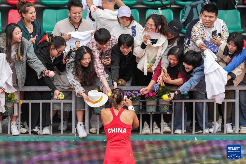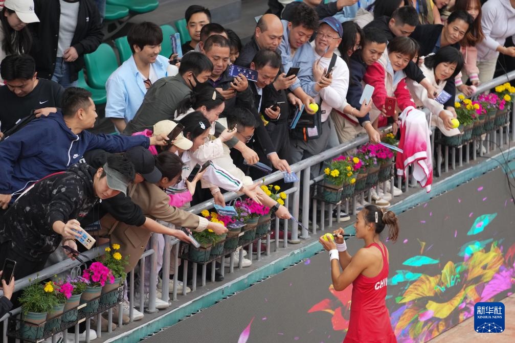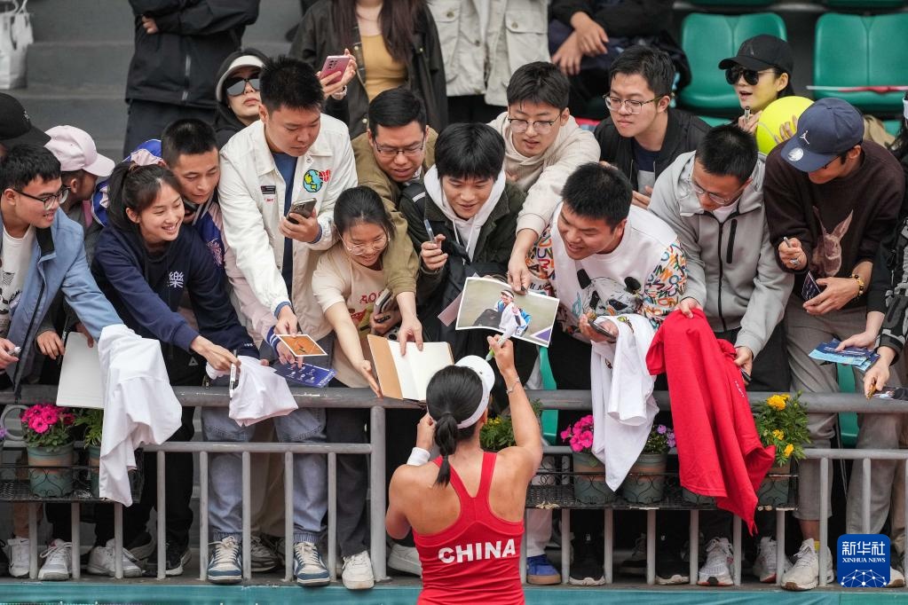 4月10日,中国队选手郑钦文(下)在比赛后为球迷签名。她2比0战胜印度队选手安基塔·拉伊娜。新华社记者 陈思汗 摄