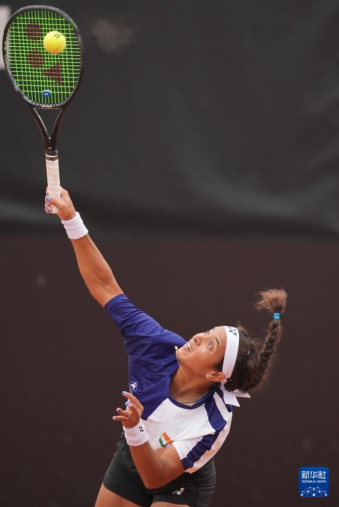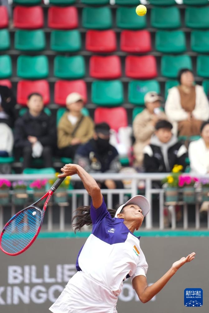 4月10日,印度队选手安基塔·拉伊娜在单打比赛中发球。她0比2不敌中国队选手郑钦文。新华社记者 薛宇舸 摄