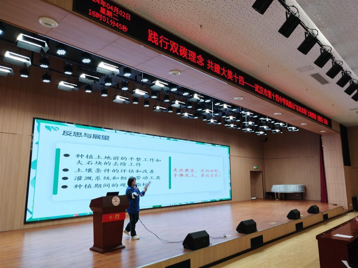 在学校报告厅内,艾钰霏站在讲台上详解介绍土地的使用方案。艾钰霏表示:“为了获得这块‘地皮’,我们班不仅详细划分了地块的不同区域,就连后期人力规划和管理细则,包括平整土地、购置种子、种植管理都已经安排好了专人负责。我们还对将要种植的植物拿出了详细的养护方案。”