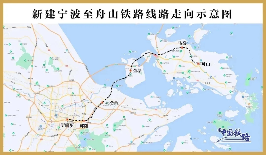 甬舟铁路西起宁波东站,经宁波市鄞州区、北仑区,舟山市金塘岛、册子岛及舟山本岛,东至定海区白泉镇,线路全长约77公里,设计时速250公里,是构建浙江省“1小时交通圈”,形成大陆与舟山岛间便捷的客运通道。