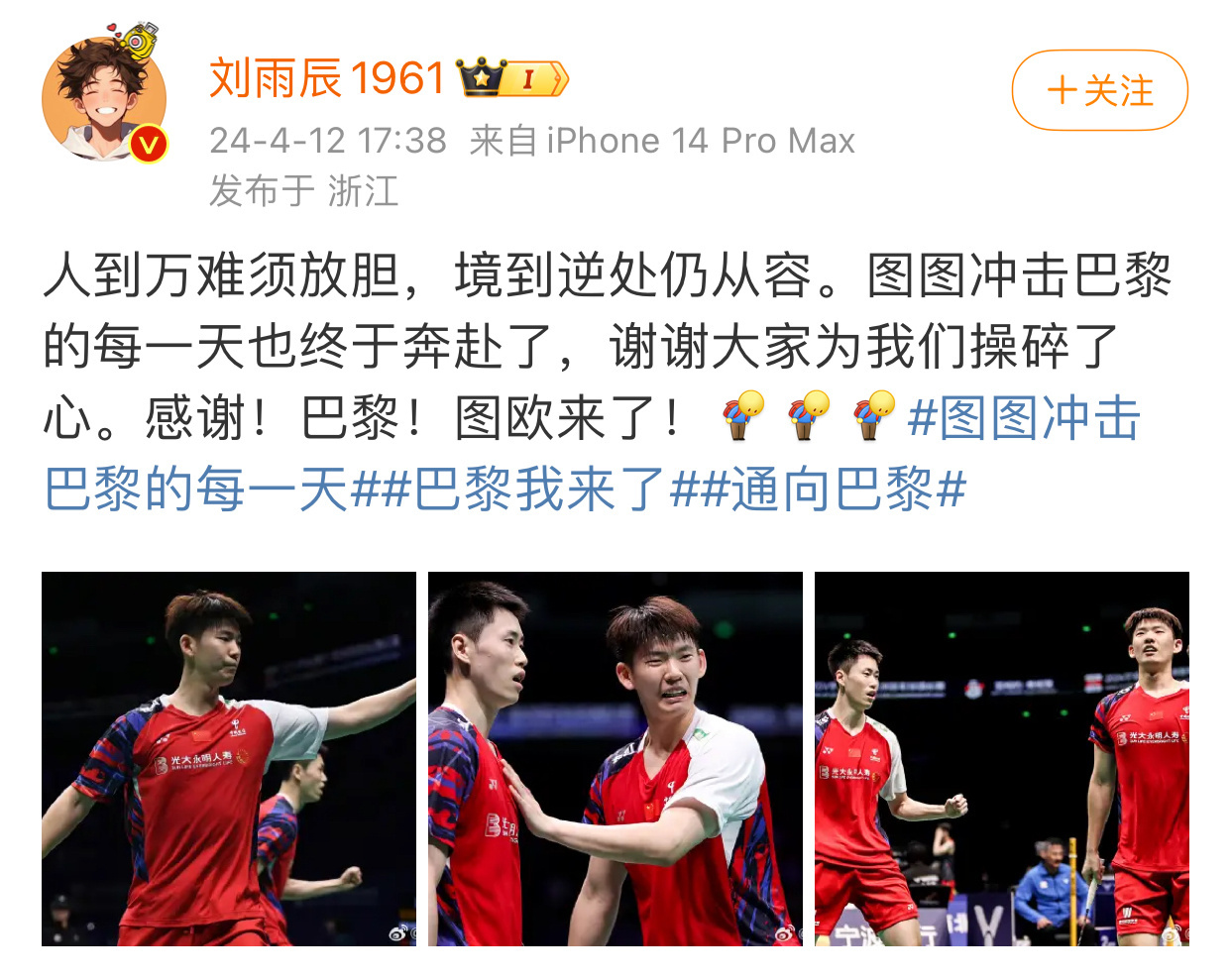 得知获得奥运资格的刘雨辰在微博上写道:“人到万难须放胆,境到逆处仍从容。谢谢大家为我们操碎了心。感谢!巴黎!我们来了!”