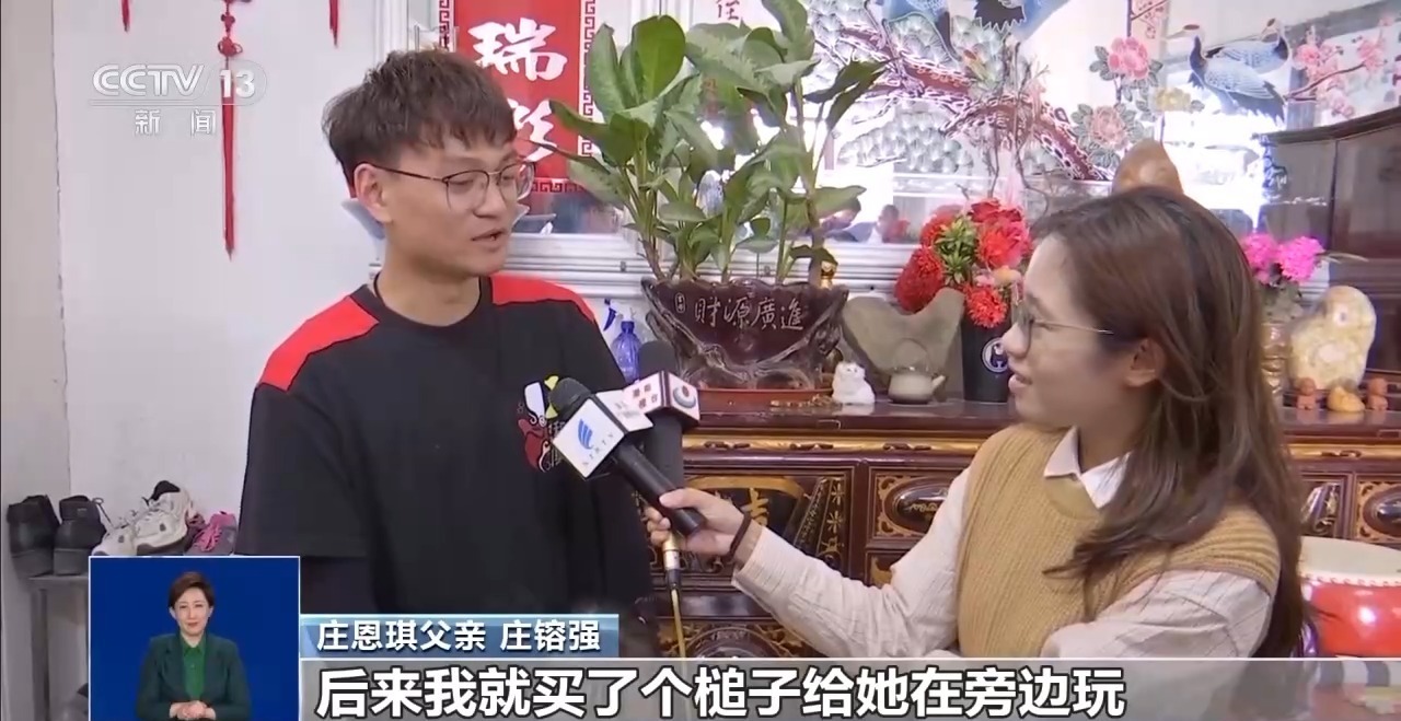 庄恩琪父亲 庄镕强:一开始我以为她好奇跟着去那边玩耍,后来我就买了个槌给她在旁边玩。她玩着玩着就一起跟队员们跳了起来,慢慢就学会了。如果外面有英歌舞表演的话,她会让我带她去。