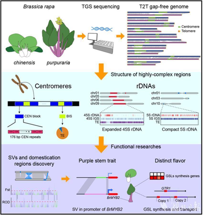 然而,同为白菜类蔬菜,紫菜薹的薹茎为何独为红色?其独特的口感风味又从何而来?4月12日,武汉大学朱玉贤院士团队王坤教授告诉记者,团队在近日的一项研究中发现,一种特异的基因组结构变异打开了调控原花青素的“阀门”,形成了紫菜薹紫红色的外观;脂肪族硫代葡萄糖苷的大量生物合成和向薹茎的高效运输,可能形成了紫菜薹的特殊风味。