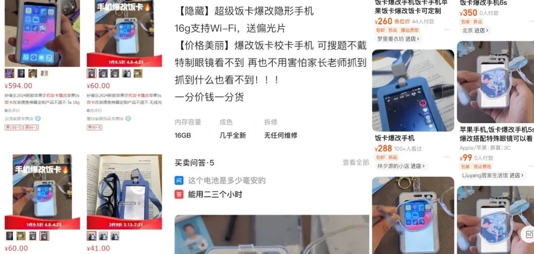 为躲避检查,这种改装过的手机号称“高科技”。平日塞进饭卡里,使用时屏幕只发白光,只有带上特制眼镜,才能看到手机内容。从买家留言看,这样的改装手机颇受学生欢迎。如此“畅销品”该怎样监管?实际情况又是怎样?