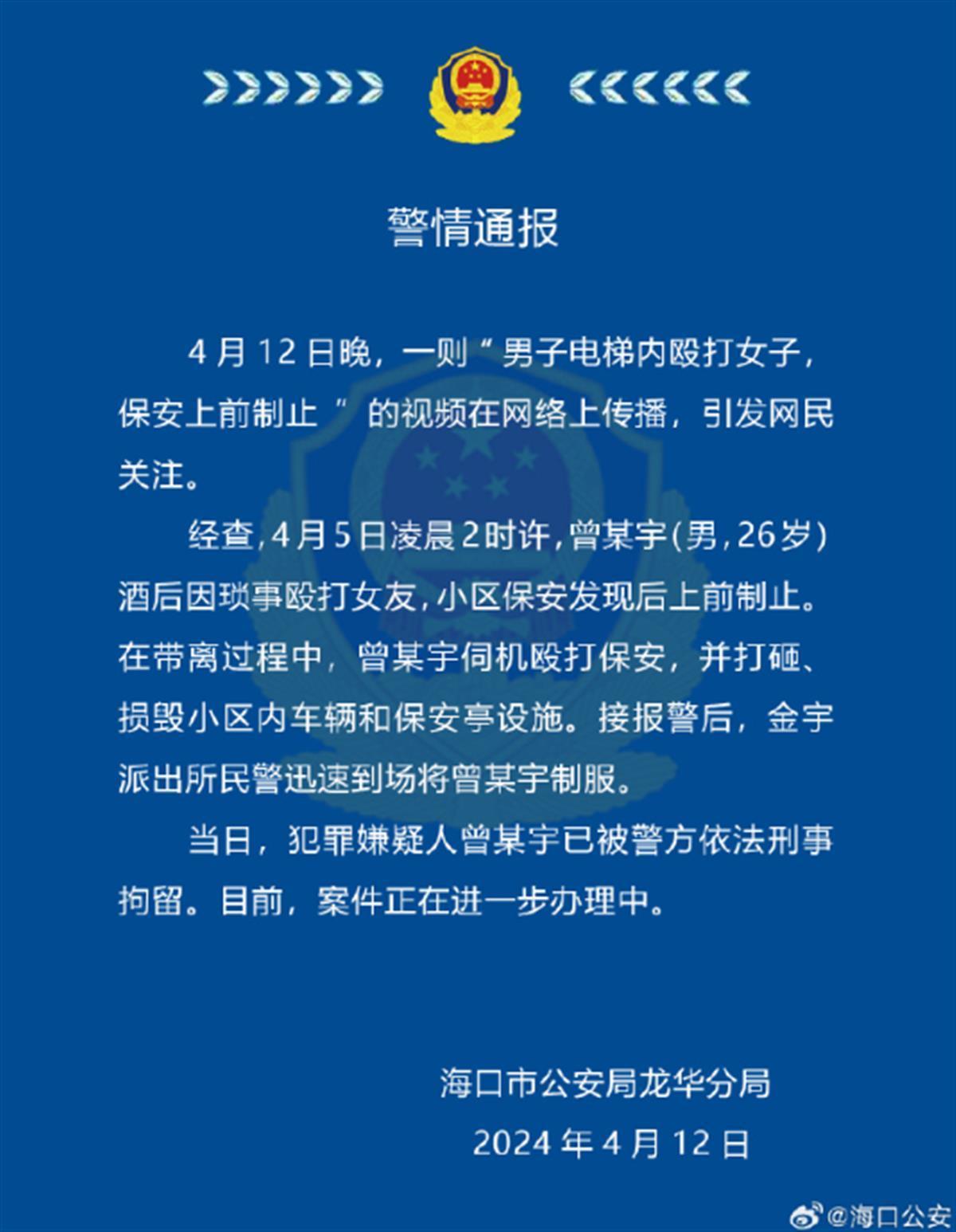 12日深夜,据海口警方通报:经查,4月5日凌晨2时许,曾某宇(男,26岁)酒后因琐事殴打女友,小区保安发现后上前制止。在带离过程中,曾某宇伺机殴打保安,并打砸、损毁小区内车辆和保安亭设施。接报警后,金宇派出所民警迅速到场将曾某宇制服。当日,犯罪嫌疑人曾某宇已被警方依法刑事拘留。目前,案件正在进一步办理中。