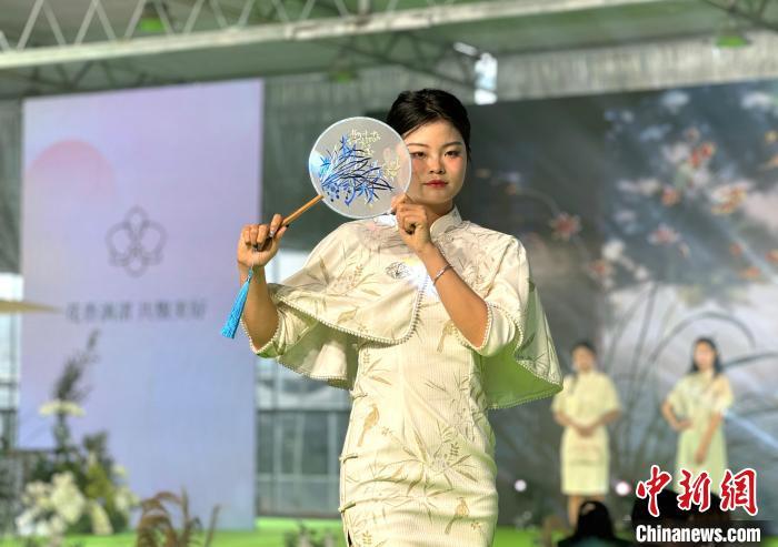 年轻姑娘手持兰花主题团扇走秀。项菁 摄