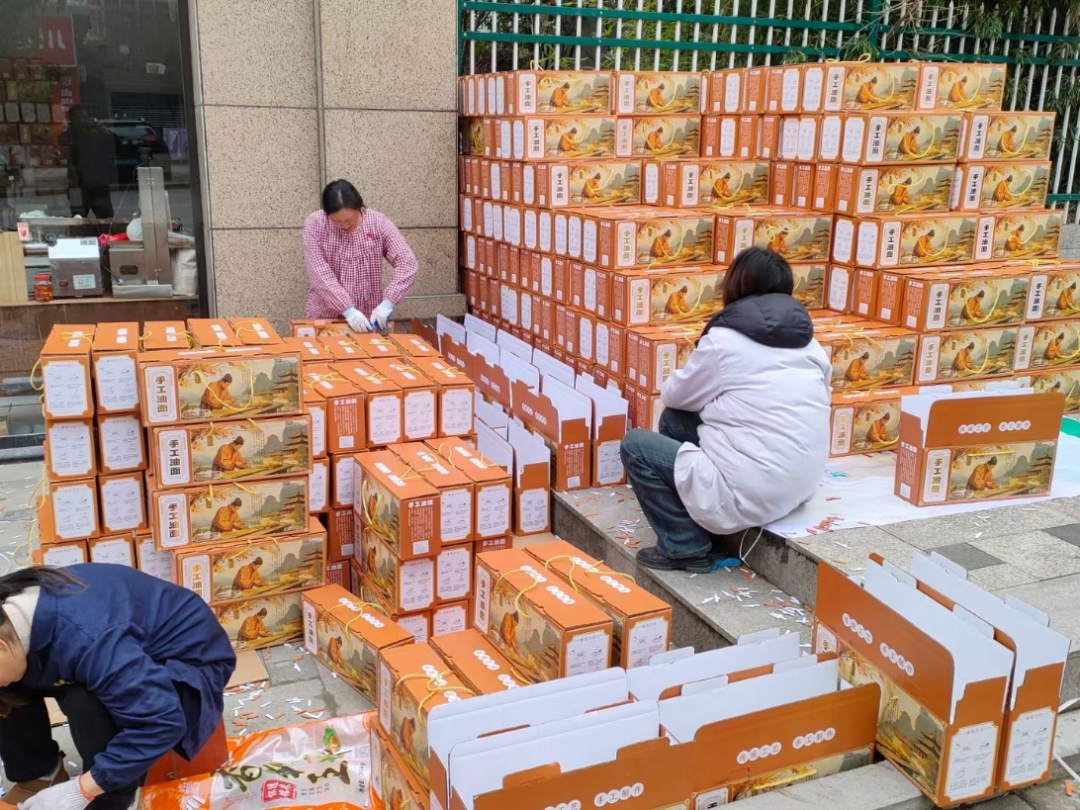 “这几天油面订单多,人手有点不够!”周潇熟练地跟员工们一起分装油面,称重、包装、装箱、封口,忙得不亦乐乎。周潇告诉记者,孝昌油面是她新开发的品种,主打儿时的味道,一经推出便成为爆款。