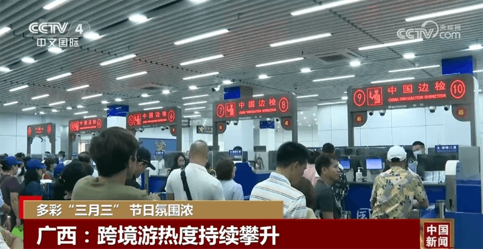 广西边检总站南宁边检站执勤一队副队长尹晓东称:“当前,以新马泰、印尼旅客为主的跨境游持续受到热捧,‘三月三’期间,东南亚入境旅客量相比于去年同期同比增长60%。”