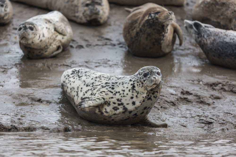 4月9日,西太平洋斑海豹在辽宁盘锦三道沟海域的滩涂上休息。新华社记者潘昱龙 摄
