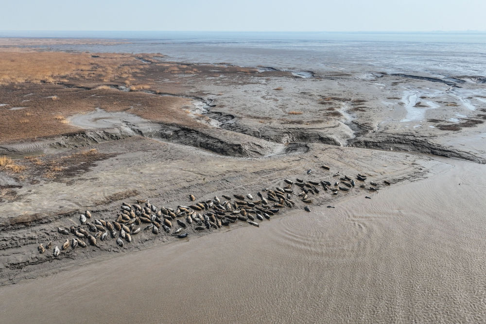 等快艇再向前驶进,透过无人机航拍,记者终于发现这群摆着一字长龙,正在晒日光浴的斑海豹。远远望去,这些斑海豹早已“融入”滩涂,同属一片泥浆色。而其中星星点点的白,一部分是斑海豹仰卧着露出的肚皮,一部分正是不久前诞生的幼崽还没褪尽的胎毛。