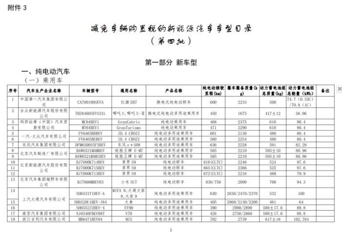 其中,在《减免车辆购置税的新能源汽车车型目录》(第四批)中,小米SU7、比亚迪海豹、智界S7等在列。