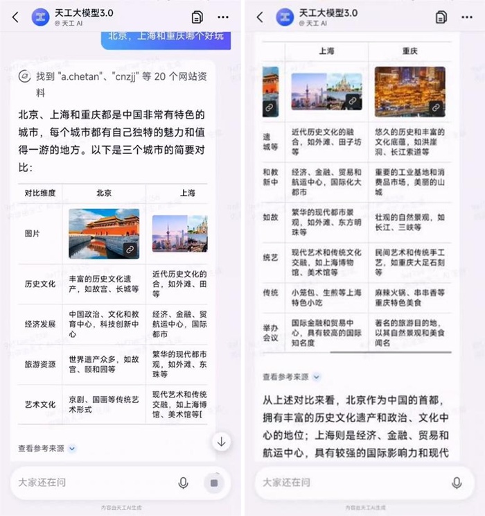 同时,“天工3.0”能够通过强大的语义理解能力将用户任务拆解成细分环节,实时判断是否需要联网或调用工具,进行单轮或多轮的联网搜索、工具调用,完成包括多轮搜索、热点信息分析、图片生成等复杂用户需求。