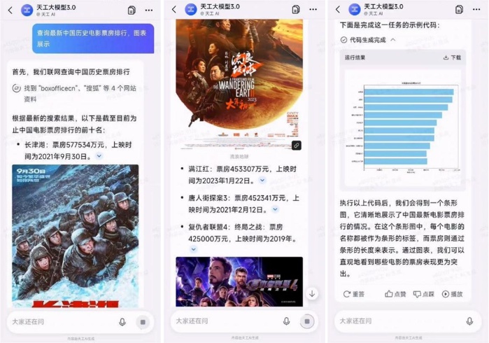 图表绘制:“天工3.0”全面提高了逻辑推理能力与用户自然语言Query的理解能力,使其能够更精准地判断用户需求,独立生成并调用代码,结合文本需求实时进行内容分析及图表构建,为用户带来更直观、高效的对比结果。