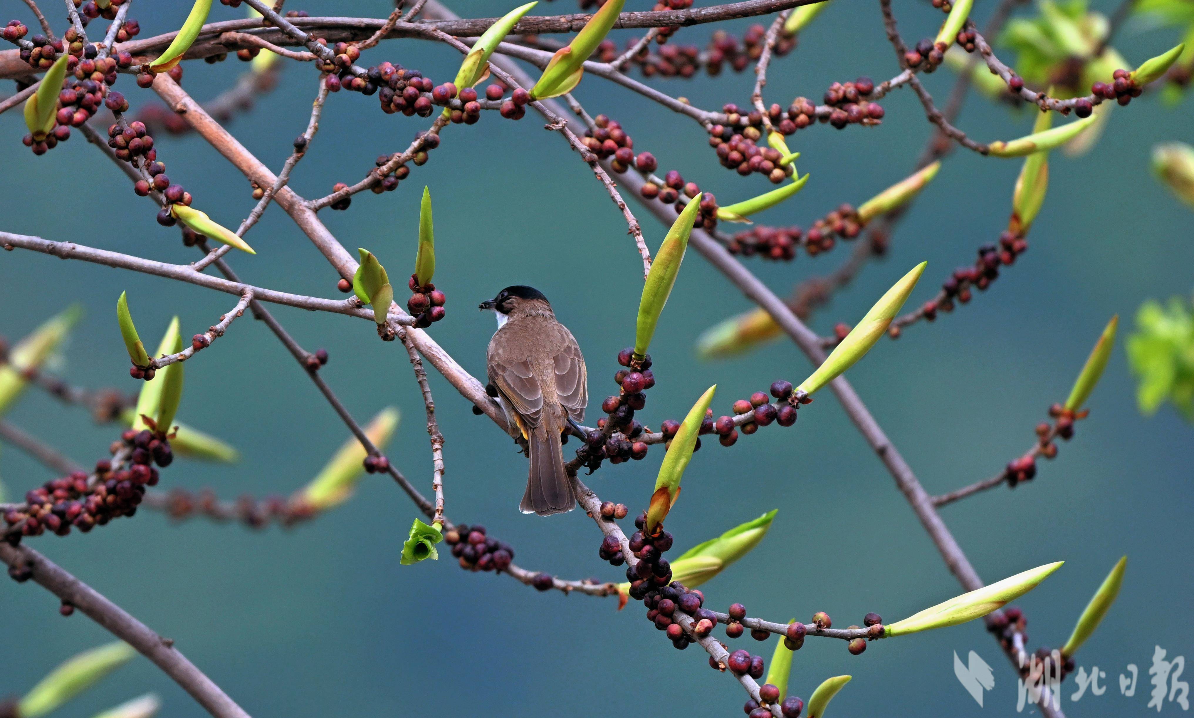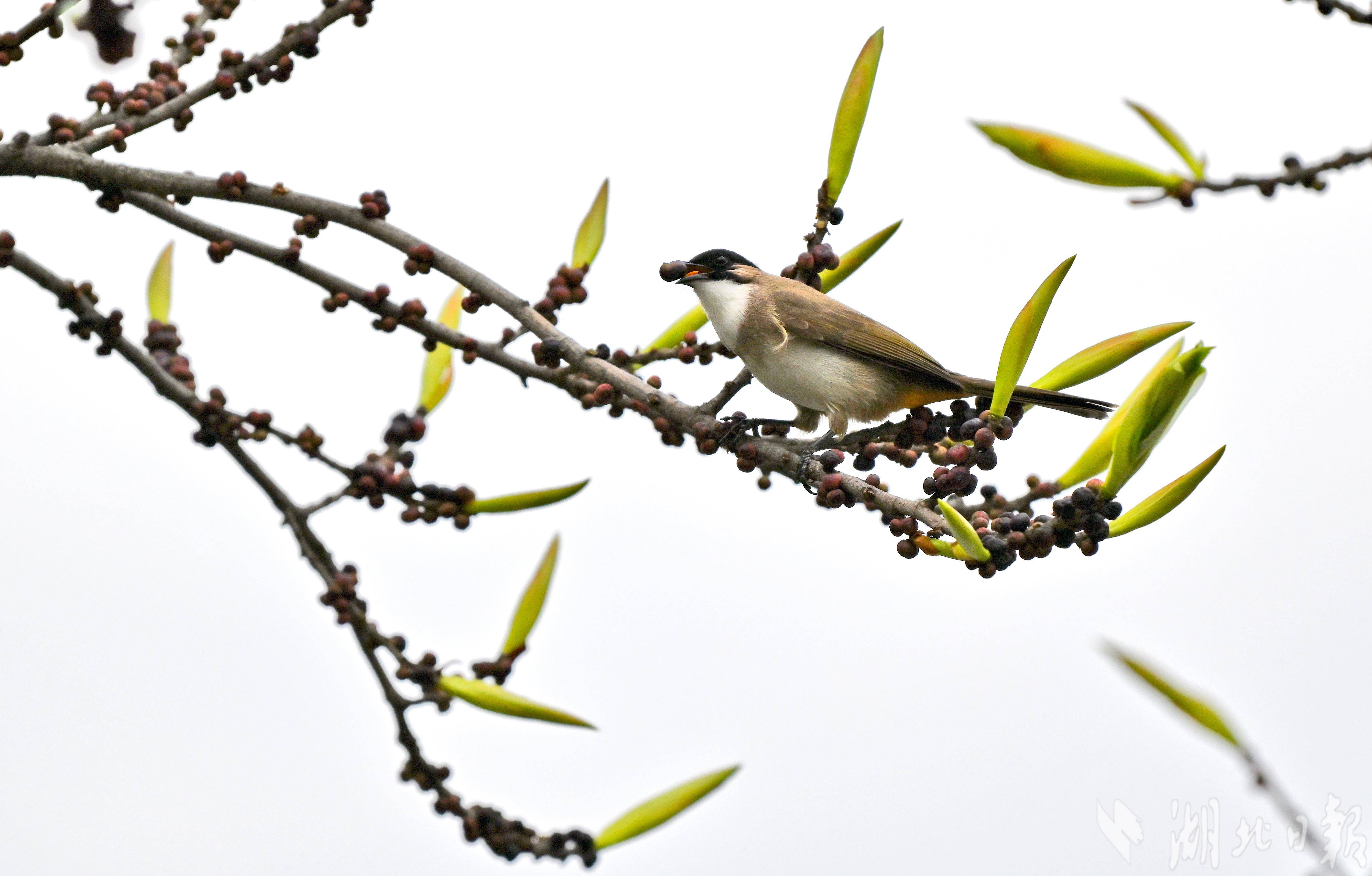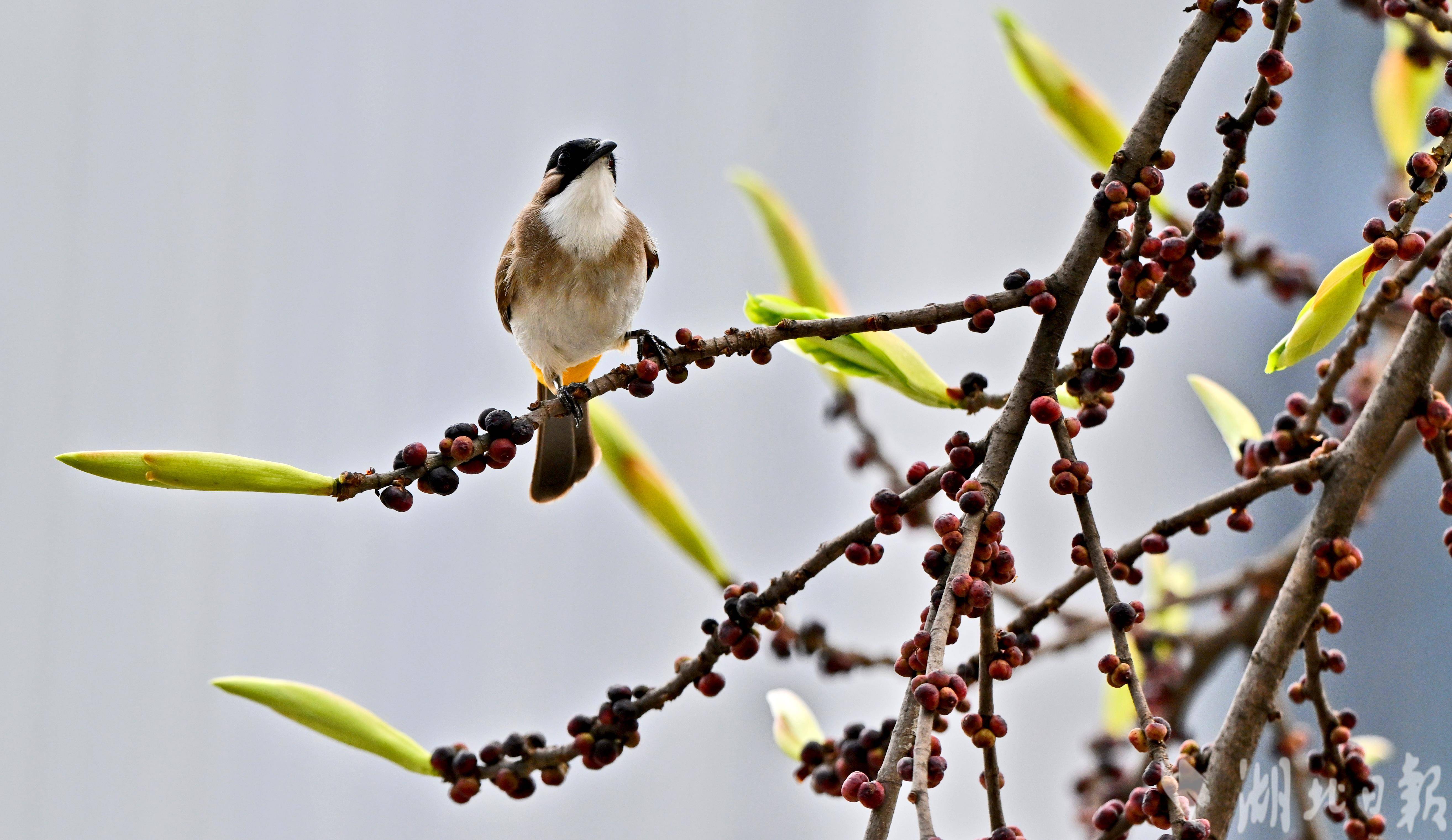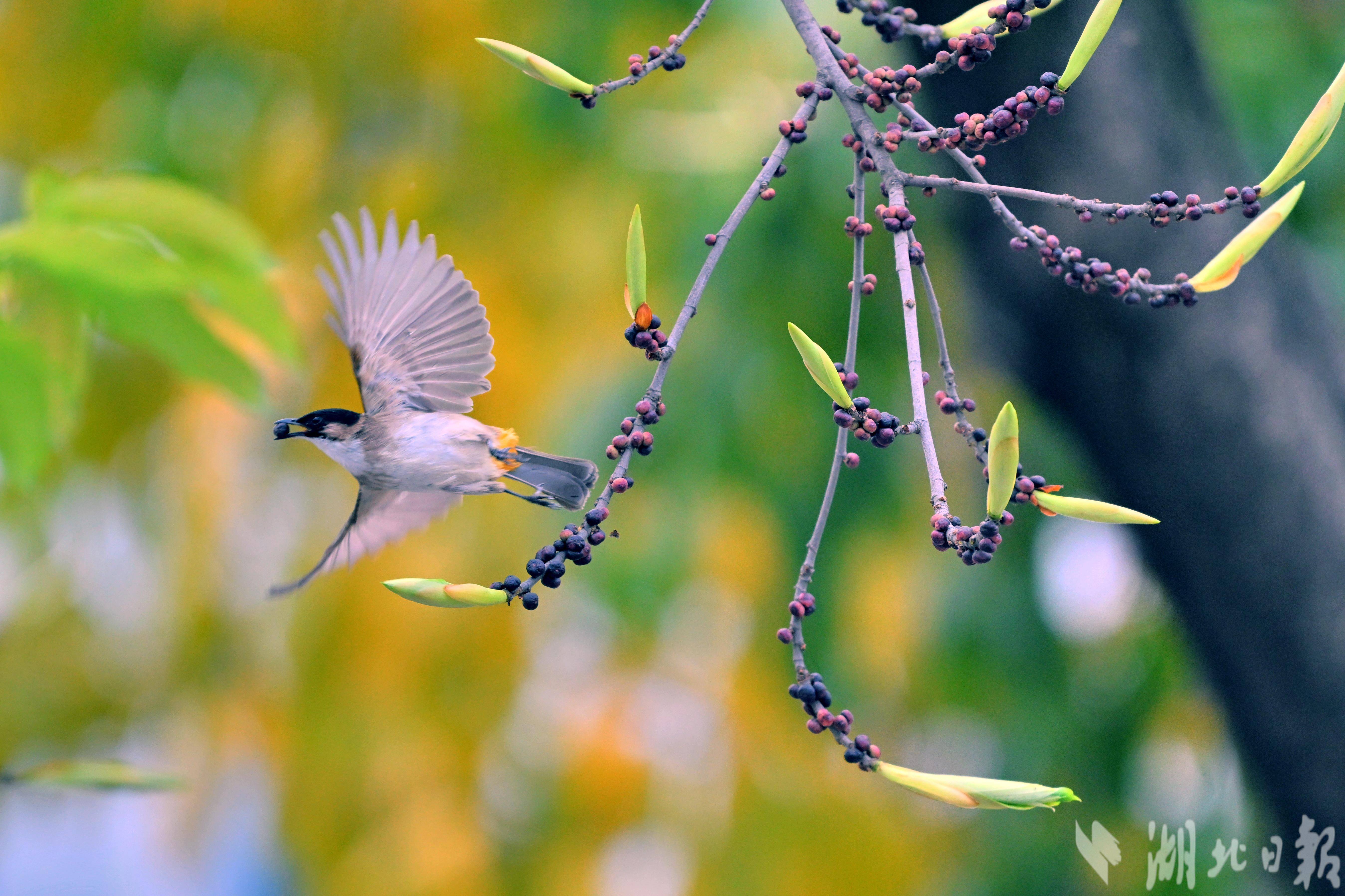 4月17日,兴山县城古夫镇内的黄桷树开始萌发新芽,树干上的果实成为鸟儿的美食,古夫镇路边行道树基本是黄桷树,春天落叶,金色的落叶与修长的新芽间小鸟嬉戏觅食,这样的景象是时下兴山街头处处可见的画面。