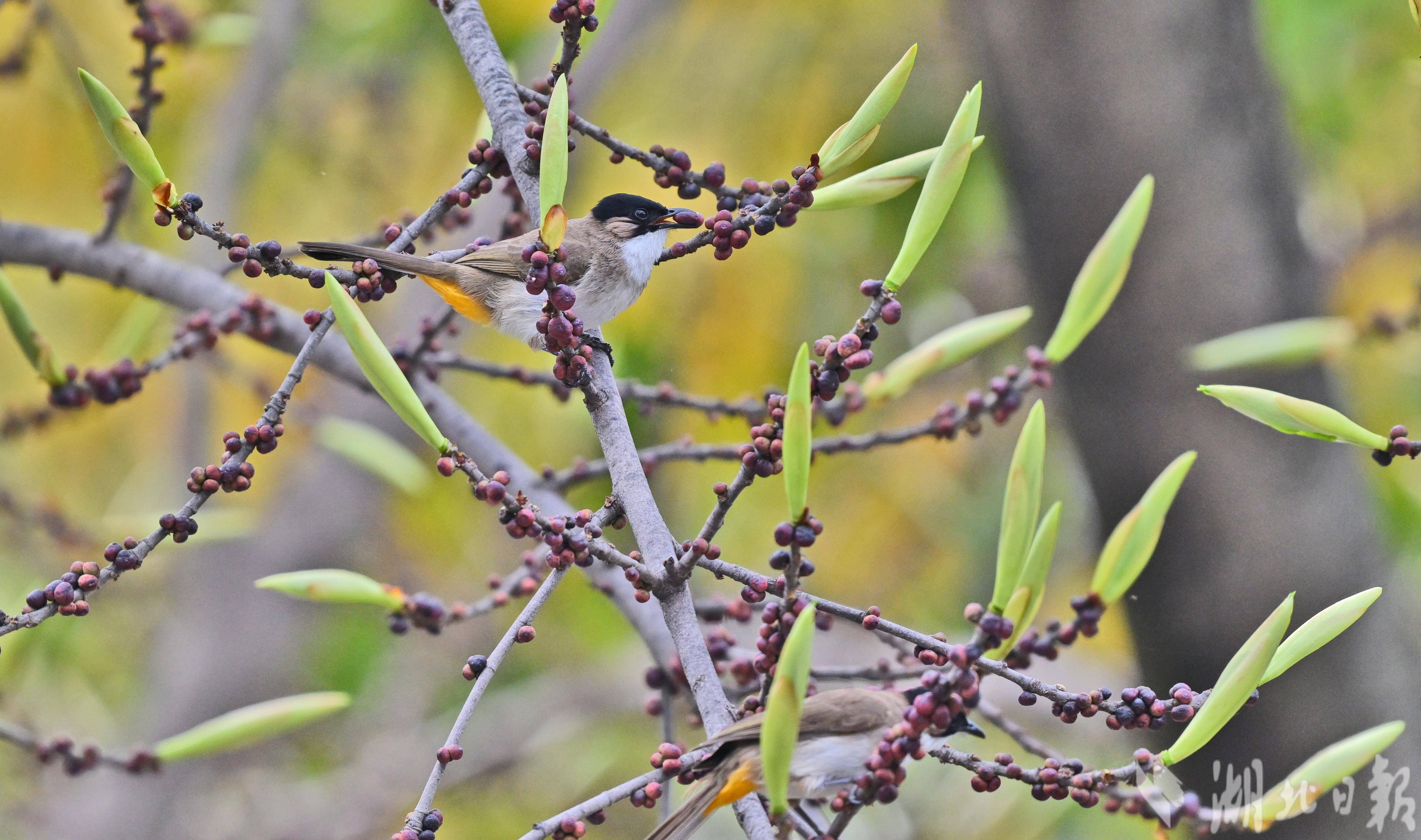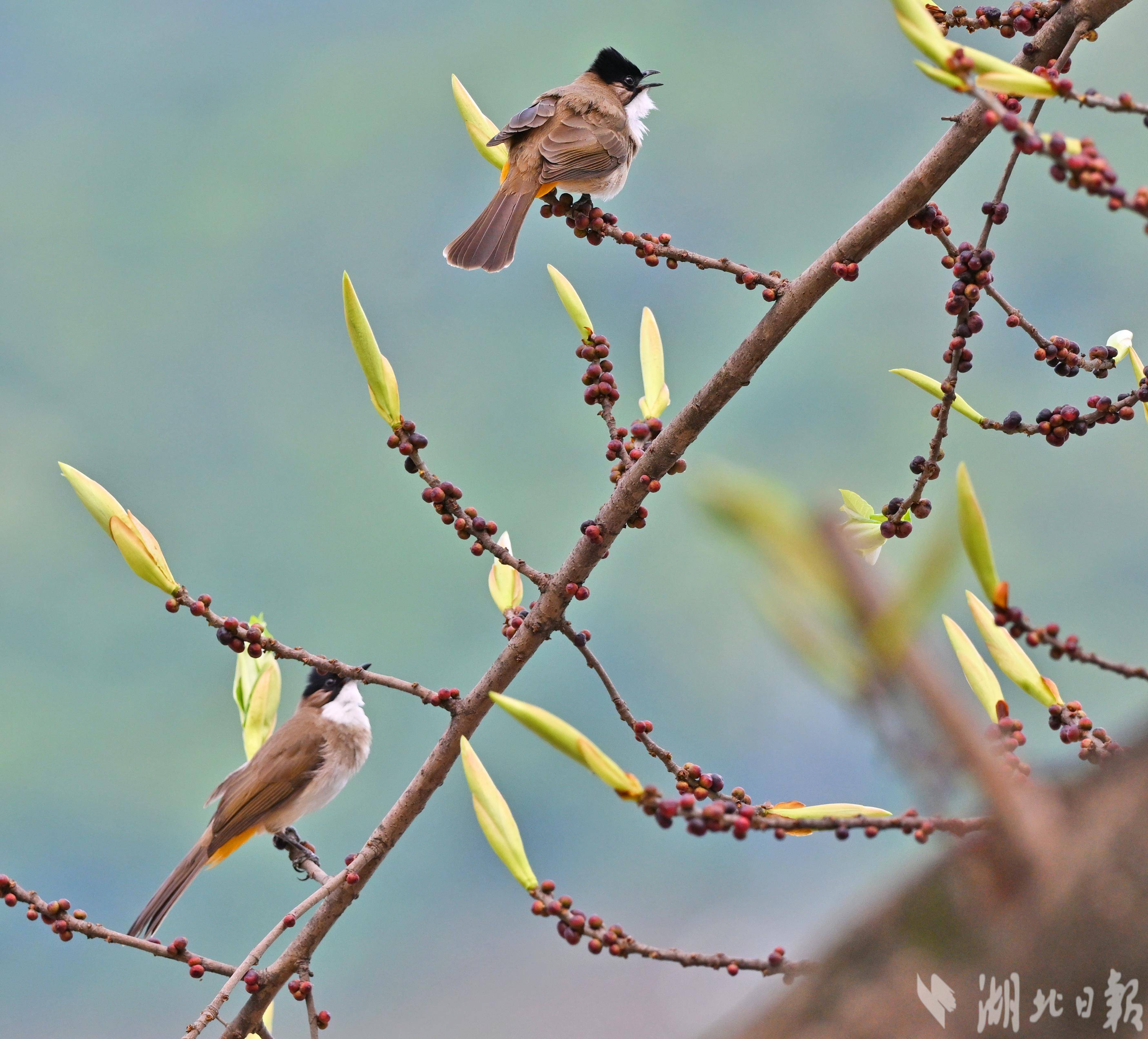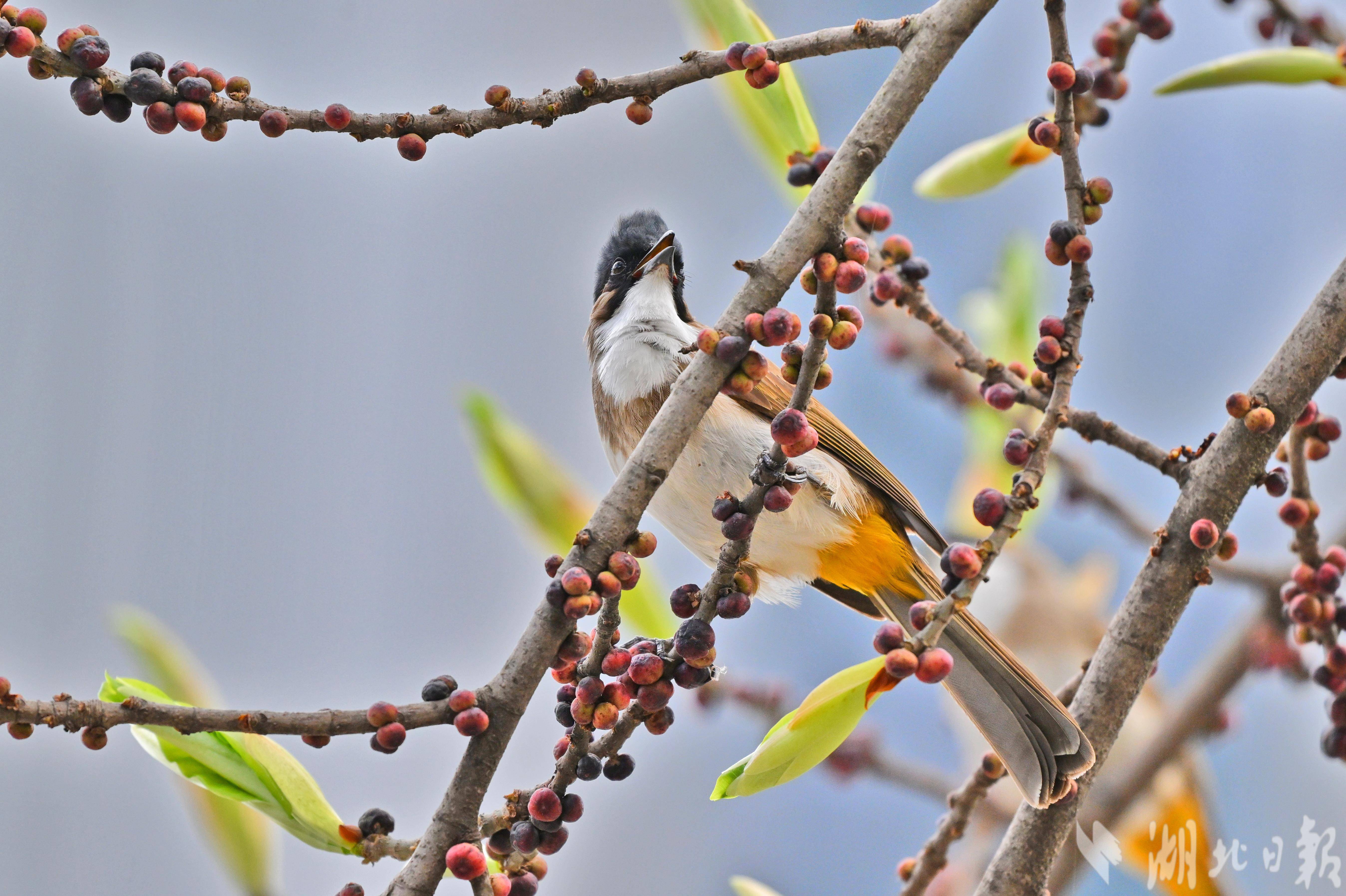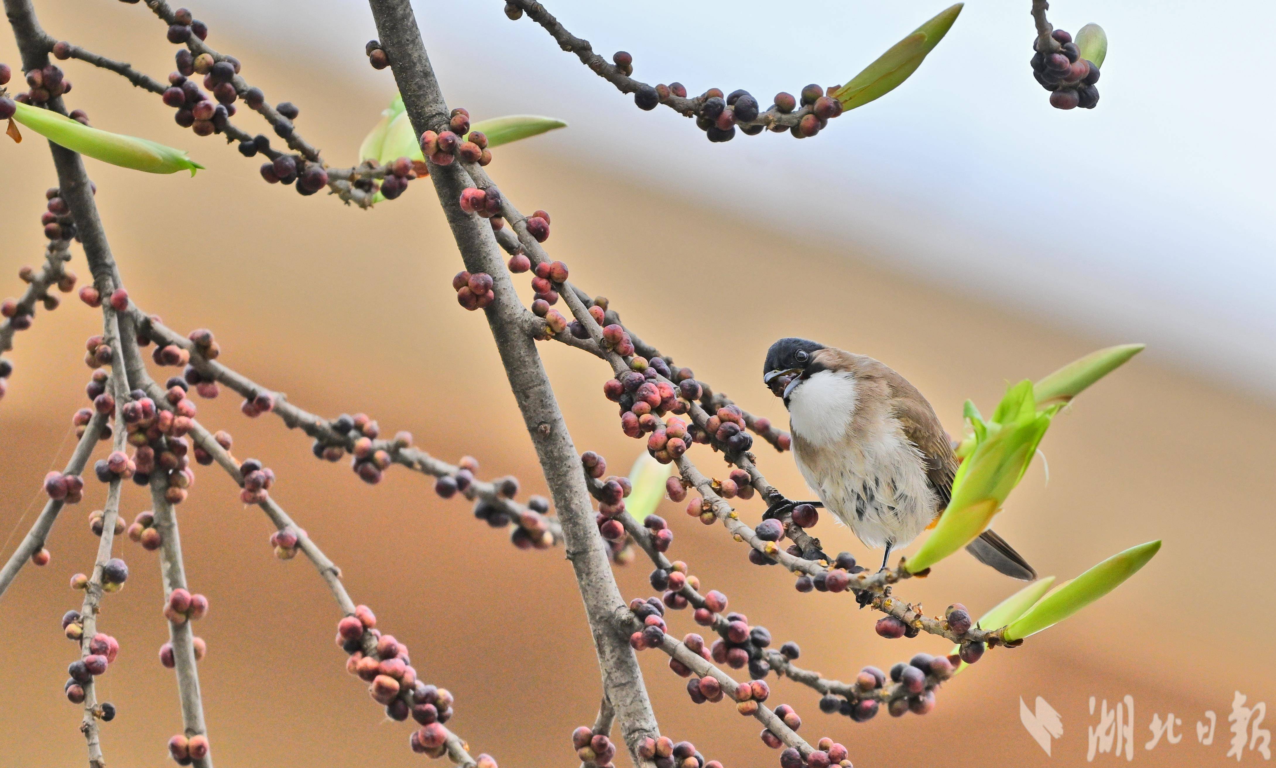 4月17日,兴山县城古夫镇内的黄桷树开始萌发新芽,树干上的果实成为鸟儿的美食,古夫镇路边行道树基本是黄桷树,春天落叶,金色的落叶与修长的新芽间小鸟嬉戏觅食,这样的景象是时下兴山街头处处可见的画面。