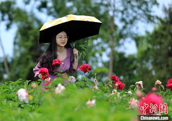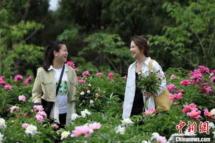 游人手拿购买的花束在芍药花丛中观赏。记者 王磊 摄