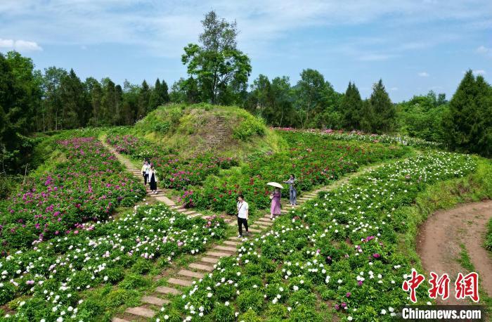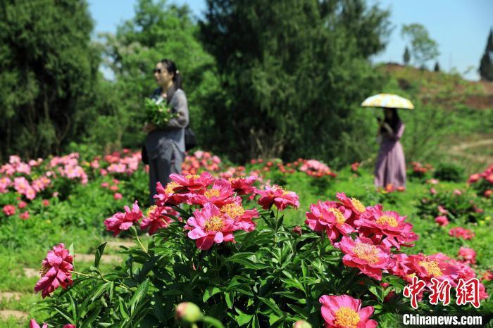 4月17日,在位于四川省西充县仙林镇的来有生态农业主题公园内,百余亩芍药花田正陆续进入了盛花期,吸引游人前来购买花束和休闲观赏。