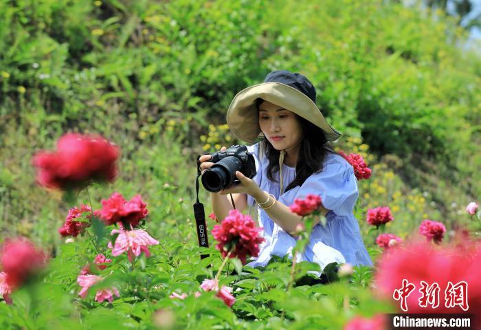 游人拍摄盛开的芍药花。记者 王磊 摄