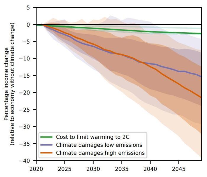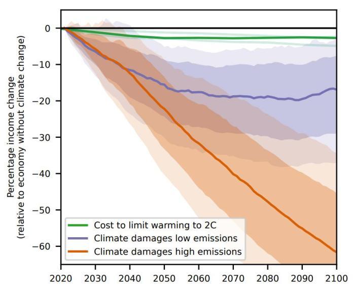 与没有气候变化的经济相比,全球收入的预计变化。到本世纪中叶,损失比实现《巴黎气候协定》所需的成本高出六倍(图片来自Maximilian Kotz)。施普林格·自然/供图