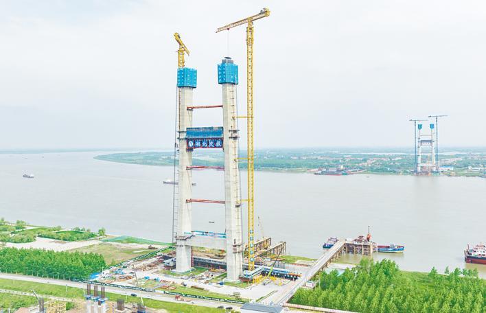 该大桥是武汉都市圈环线高速公路的重要组成部分,目前项目进展顺利,北岸主墩净高已超180米。