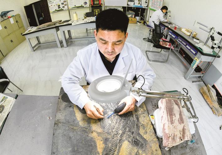 牛东毅正在修复鱼龙化石