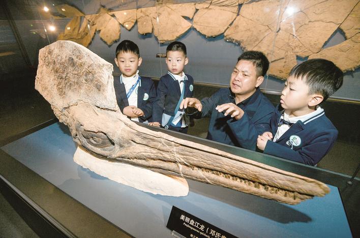 给来参观的孩子讲解化石