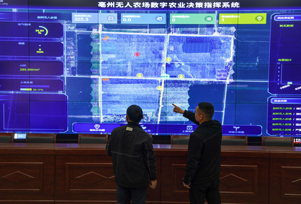 当下,在安徽省亳州市谯城区智慧农场里,“90后”新农人焦瑞端坐在调度大厅内,通过近200平方米的智慧大屏将农作物的长势尽收眼底。